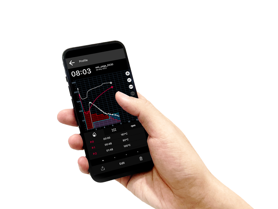 | 1公斤於3.5分鐘降至40°C | 含|烘焙數據將自動儲存於裝置*本機自動存取為5筆,裝置則不限 | ||