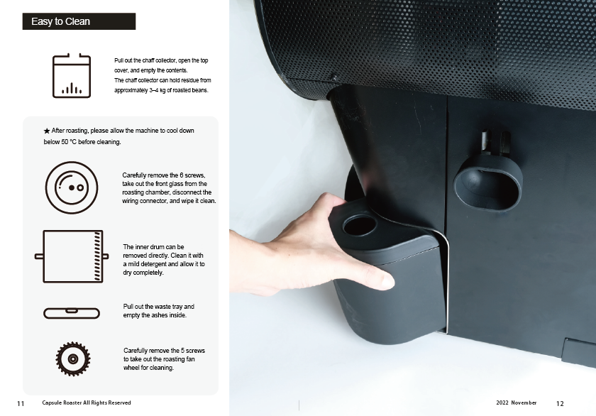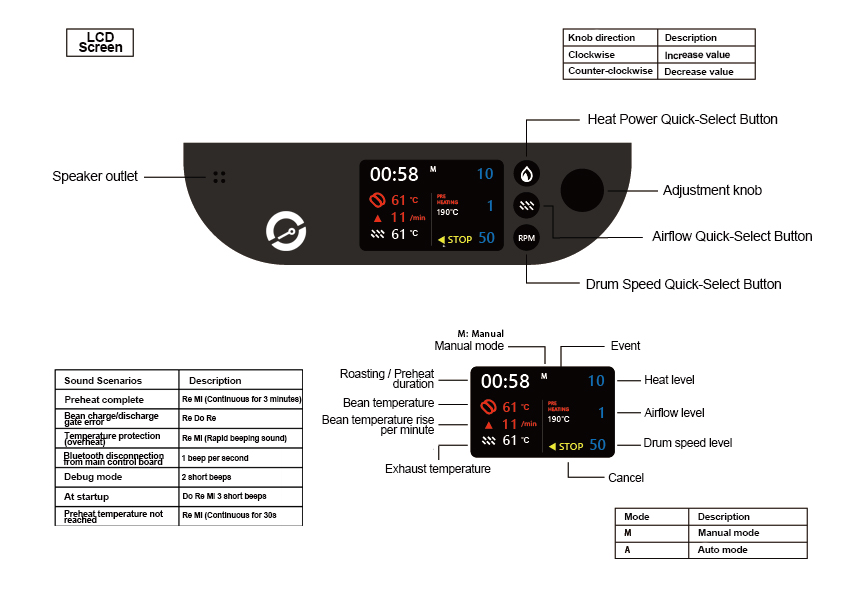 Fully automatic mode includes bean loading/unloading, roasting, and cooling systems, and can be controlled from both the main unit and the APP. In this mode, users can select a roasting curve based on the corresponding “bean type / weight.” Roasting data can be reviewed from either the device memory or the machine itself.